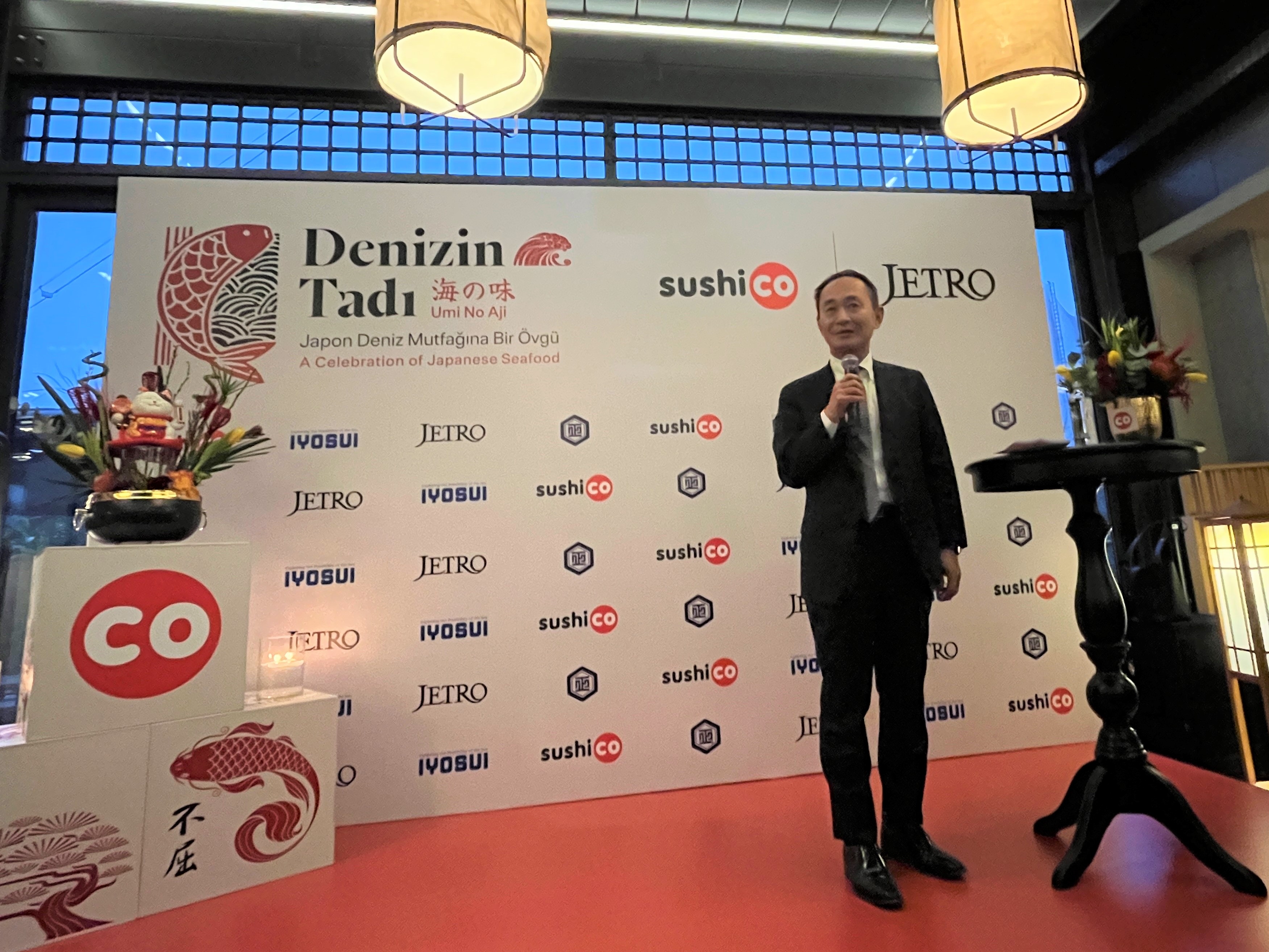 3 Şubat'ta, Başkonsolos Iwama Japon deniz ürünleri tanıtım etkinliğine katıldı. JETRO İstanbul ofisi tarafından SushiCo Zen'de düzenlenen etkinlikte, deniz ürünleri ihracatı konusunda uzmanlaşmış Iyosui Co., Ltd. şirketinin Japon sarıkuyruk balığı, deniz tarağı ve istavrit balığı kullanılarak hazırlanan zengin ve lezzetli Japon yemekleri sunuldu. Etkinlikte ayrıca Ito En şirketinin Japon yeşil çayları tanıtıldı. Katılımcılar Japon mutfağı hakkında daha geniş bilgi edinme fırsatı buldular.