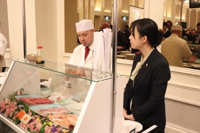 レセプションでは、17社の日本企業による事業展示が行われ、寿司を始めとする日本食が提供されました。