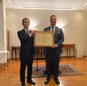 3月6日、総領事公邸にて、帰国留学生の集いレセプションを開催しました。また、この機会に、トルガ・オズシェン・チャナッカレ・オンセキズ・マルト大学教育学部日本語教育学科長に対する在外公館長表彰式を実施しました。オズシェン学科長は、元国費留学生として、若い世代に対する日本語教育や日本文化普及などの活動を通じて日本とトルコの将来の架け橋となる後進の育成に大きく貢献されています。